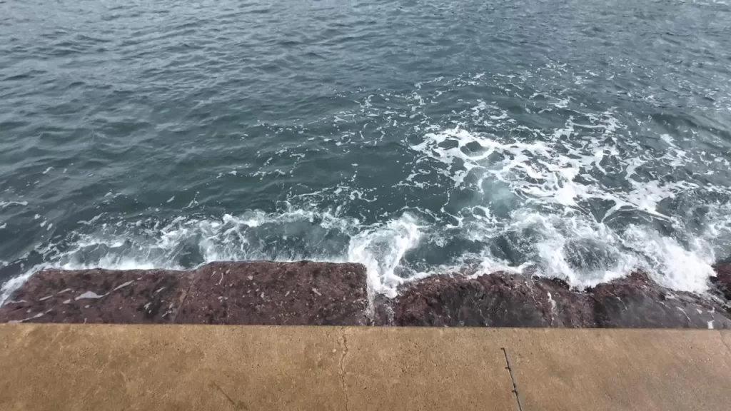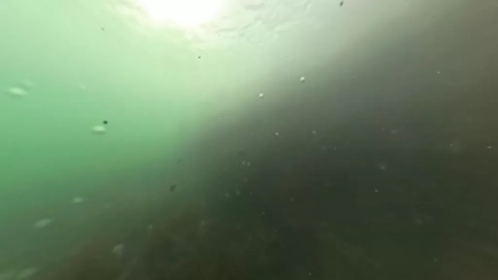 ポイント②は外側防波堤の先端内向きです。先端は岩場で足場が悪いです。ここも海底はロックベ-スです。水中映像では魚影が確認できましたが、遠いために魚種はわかりませんでした。ここは海流の流れの変化があるポイントです。